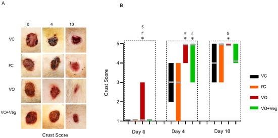 Representative images of crust in respective groups and treatment evaluation time (A). Graph of crust scores in VC, PC, VO, and VO + Veg groups, in three periods of evaluation. The bars represent the data dispersion (minimum and maximum), and the horizontal gray lines represent mode (B). * p < 0.05: VO vs. VC; # p < 0.05: VO vs. PC, and $ p < 0.05: VO vs. VO + Veg.