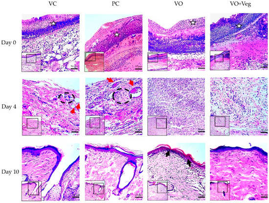 Histological microscopic representative images of the wound healing process of the experimental groups VC, PC, VO, and VO + Veg. Skin sections demonstrate dermis and epidermis stained with hematoxylin and eosin at 10× (smallest figure) and 20× (larger figure) magnifications. The white stars indicate the granulation tissue region. Red arrows indicate perivascular inflammatory infiltrate in the upper dermis, with dotted black demarcation lines of regions rich in inflammatory cells. On day 10, the epidermis layer (upper edge) is highlighted, with a keratin-rich stratum corneum, mainly in the group, indicated by the black arrows.