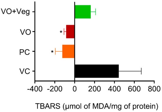 Thiobarbituric acid-reactive substance (TBARS) measurements were taken on 0 and 10 days after the treatment to obtain the difference (delta) between the last and the first day of treatment (Figure 8). The PC group (PC: −124.3 ± 70, µmol MDA/mg protein, p < 0.05) and treatment with VO (−84 ± 22 µmol MDA/mg protein, p < 0.05) were able to reduce lipid peroxidation compared to the VC group (443 ± 226 µmol MDA/mg protein). However, the VO + Veg group showed no difference (VO + Veg: 162 ± 48 µmol MDA/mg protein).