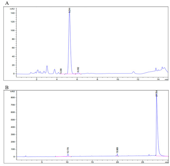 Purity test by HPLC-UV detector (Wavelength = 210 nm) for each esterified fructo-oligosaccharides. (A) Ac-FOS, (B) Bu-FOS.