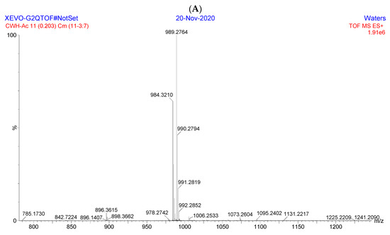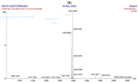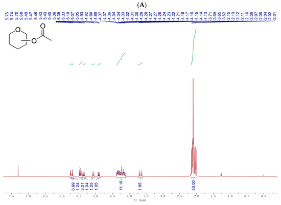High-resolution mass spectrometry (HRMS) experiments were used to acquire the exact mass and elemental composition of each esterified fructo-oligosaccharides. As shown in Figure 3A, HRMS (ESI) of Ac-FOS was calculated for C40H58NO27 [M + NH4]+as 984.3196 and found as 984.3210, while that calculated for C40H54O27Na [M + Na]+ was 989.2750 and found as 989.2764. As shown in Figure 3B, HRMS (ESI) of Bu-FOS calculated for C62H102NO27 [M + NH4]+ was 1292.6639, and found as 1292.6650, while that calculated for C62H98O27Na [M + Na]+ was1297.6193, and found as 1297.6208. The HRMS results indicated that 11 acetyl groups were found at Ac-FOS, and 11 butyryl groups were found at Bu-FOS. The results of HRMS were consistent with the NMR results.