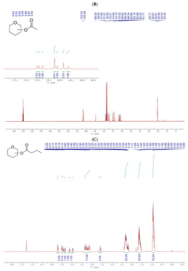 Nuclear magnetic resonance (NMR) spectra of esterified fructo-oligosaccharides. (A) 1H-NMR of Ac-FOS, (B) 13C-NMR of Ac-FOS, (C) 1H-NMR of Bu-FOS, and (D) 13C-NMR of Bu-FOS.