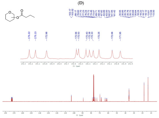 13C NMR (101 MHz, CDCl3) δ 173.22 (C=O), 173.13 (C=O), 172.98 (C=O), 172.56 (C=O), 172.53 (C=O), 172.43 (C=O), 172.38 (C=O), 172.33 (C=O), 172.25 (C=O), 172.06 (C=O), 171.95 (C=O), 103.17, 103.02, 89.17, 78.60, 77.70, 77.23, 76.24, 75.72, 74.46, 73.07, 69.71, 68.45, 67.82, 63.89, 63.00, 62.07, 61.95, 61.42, 35.95 (COCH2CH2CH3), 35.85 (COCH2CH2CH3), 35.79 (COCH2CH2CH3), 35.76 (COCH2CH2CH3), 35.72 (COCH2CH2CH3), 35.68 (COCH2CH2CH3), 35.64 (COCH2CH2CH3), 18.24 (COCH2CH2CH3), 18.22 (COCH2CH2CH3), 18.17 (COCH2CH2CH3), 18.12 (COCH2CH2CH3), 13.61 (COCH2CH2CH3), 13.58 (COCH2CH2CH3), 13.50 (COCH2CH2CH3).
