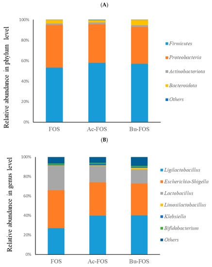 Figure 4A shows the relative abundance of dominant phylum and genus in FOS, Ac-FOS, and Bu-FOS groups. The FOS, Ac-FOS, and Bu-FOS samples had a similar dominant phylum, including Firmicutes, Bacteroidota, Proteobacteria, and Actinobacteriota. At the genus level, Ligilactobacillus, Escherichia-Shigella, Lactobacillus, Limosilactobacillus, Klebsiella, and Bifidobacterium were found in all samples (Figure 4B). Importantly, most of them have well-known benefits to host health.