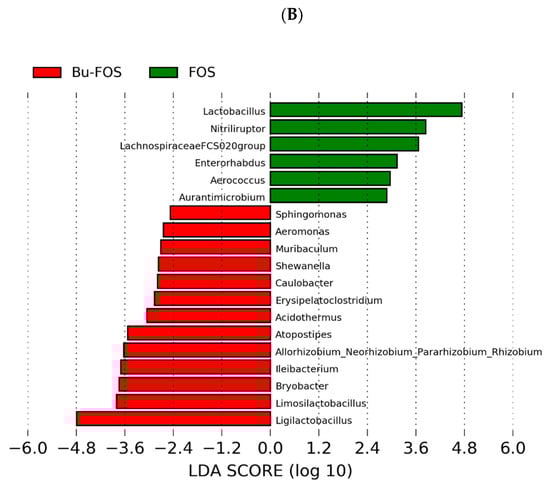 Comparison of relative abundance between different groups in genus level by LEfSe analysis. The items with LDA scores > 2.0 are listed, indicating a higher relative community abundance change in the corresponding group than in other groups. (A) FOS and Ac-FOS, (B) FOS and Bu-FOS.