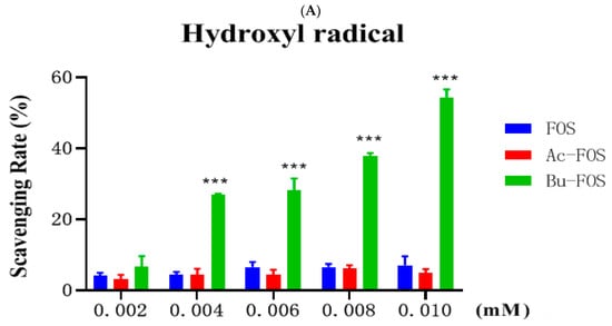 As shown in Figure 6A, the hydroxyl radical scavenging abilities of both FOS and Ac-FOS were lower than 10%, with no linear relationship in all concentrations. There was no significant difference between FOS and Ac-FOS in hydroxyl radical scavenging ability. However, a significant increase in hydroxyl radical scavenging rate could be observed in a dose-dependent manner with the Bu-FOS supplement, which was much higher than FOS and Ac-FOS at any concentration. At a concentration of 0.01 mol/mL, the hydroxyl radical scavenging ability reached 54.48%.