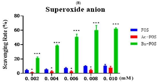 Antioxidant activity of FOS, Ac-FOS, and Bu-FOS. (A) Hydroxy radical activity, (B) Superoxide anion activity. “*”: p < 0.05, means changes in different concentrations.; “***”: p < 0.001, represents highly significant differences in different concentration gradients.