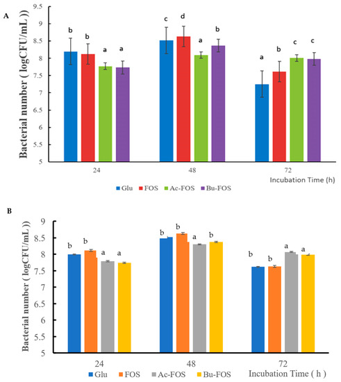 As shown in Figure 7A, when L. rhamnosus was incubated in different culture mediums with four supplements at 24 h, the number of live bacteria in the glucose group was higher than that of Ac-FOS and Bu-FOS groups. After 48 h incubation, the FOS group had the highest bacterial number of L. rhamnosus, while the bacteria numbers in Ac-FOS and Bu-FOS groups were still lower than that of glucose group. Although the numbers of viable bacteria in all four groups decreased after 72 h incubation, the Ac-FOS group and Bu-FOS had higher bacteria numbers than that FOS group and the glucose group. As shown in Figure 7B, the growth trend of B. longum was similar to that of L. rhamnosus.