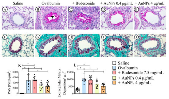 3.3. AuNPs Inhibit Allergen-Induced Mucus Production and Peribronchiolar Collagen Deposition Caused by Allergen Provocation