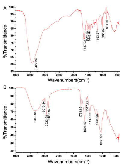 The FTIR spectra of PSM and LPSM loaded resveratrol were shown in Figure 3, and the FTIR spectra of microspheres without resveratrol were shown in Figures S1 and S2. O-H stretching at wavenumbers ranging from 3300 to 3500 cm −1 probably represent the hydroxyl group of polysaccharides and the phenolic hydroxyl group of resveratrol. The peaks at 1587.02 cm−1, 1512.37 cm−1, and 1443.64 cm−1 in PSM, 1597.40 cm−1, 1517.77 cm−1, and 1417.62 cm−1 are the characteristic absorption peaks of the aromatic skeletons in resveratrol, indicating the successful encapsulation of resveratrol. The peaks at 1153.57 cm−1 of PSM and 1144.06 cm−1 represent the C-O-C stretching of polysaccharides.