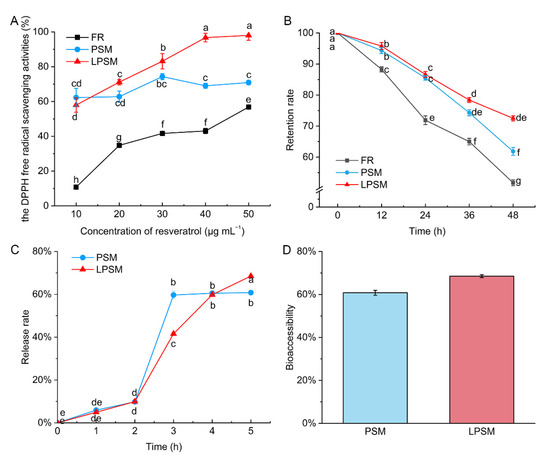 The antioxidant capability (A), retention rate (B) in response to ultraviolet, release rate in vitro (C) and bioaccessibility (D) of resveratrol in different forms. The first two hours were in simulated in gastric fluid, and the latter three hours in simulated intestinal fluid.FR, free resveratrol; PSM, polysaccharide self-assembled microspheres; LPSM, lecithin-polysaccharide self-assembled microspheres. Different letters indicate significant difference.