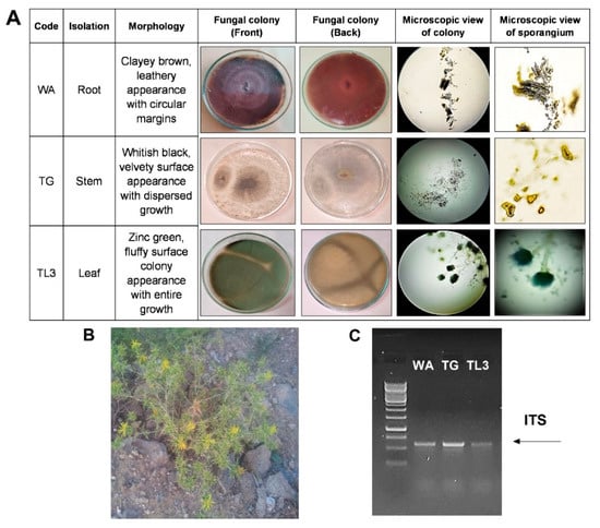 Figure 1. (A) Morphological characterization of selected fungal strains WA, TG, and TL3, (B) Xerophytic plant (Carthymus oxycantha L.) selected for isolation, and (C) genotyping of selected fungal strains by ITS region amplification.