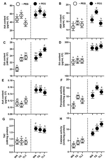 WA, TG, and TL3 isolates also ably produced antioxidant enzymes with stronger antioxidant capacity, under PEG-induced drought stress (Figure 3). By supplementing 8% PEG, culture filtrates exhibited significantly (p ≤ 0.05) higher POX activity by WA (1.5-fold), TG (0.66-fold), TL3 (0.55-fold), CAT activity by WA (3.2-fold), TG (2.3-fold), TL3 (1.75-fold), and total antioxidant capacity by WA (1.8-fold), TG (0.75-fold), TL3 (0.54-fold). The ascorbic acid (non-enzymatic antioxidant) level was also induced by WA (0.6-fold), TG (0.5-fold), TL3 (0.08-fold) in culture filtrate under stress, compared to control (0% PEG) (Figure 3).