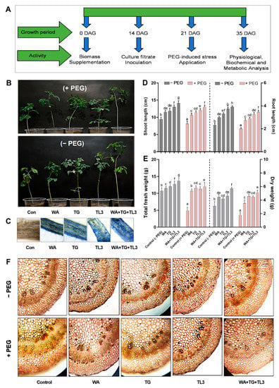 Figure 5. Effect of WA, TG, and TL3 inoculation on M. oleifera plant growth. (A) Schematic representation of the M. oleifera plant bioassay, (B) phenotypic analysis; upper penal (plants supplemented with PEG) and lower penal (plants without PEG supplementation), (C) root colonization by fungal endophytes, (D) shoot length (right penal), and root length (left penal), (E) total fresh weight (right penal), and total dry weight (left penal), (F) stem anatomical features. Quantitative data represent means ± SE of three independent biological replicates presented with various letters showing differences at a significance level of p ≤ 0.05 using Duncan’s multiple range test (DMRT).