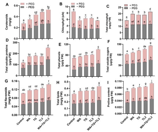 Figure 6. Effect of WA, TG, and TL3 inoculation on M. oleifera growth promoting metabolites. (A) Carotenoids, (B) chlorophyll a/b ratio, (C) total chlorophyll, (D) total soluble proteins, (E) total phenols, (F) total soluble sugars, (G) total flavonoids, (H) total lipids, and (I) proline content. Quantitative data represent means ± SE of three independent biological replicates presented with various letters showing differences at the significance level of p ≤ 0.05 using Duncan’s multiple range test (DMRT).