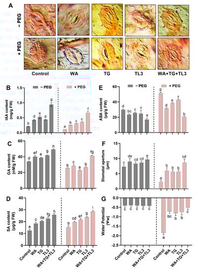 Figure 7. Effect of WA, TG, and TL3 inoculation on M. oleifera phytohormonal contents. (A) Stomatal anatomy, (B) IAA, (C) GA, (D) SA, (E) ABA, (F) stomatal aperture, and (G) water potential. Quantitative data represent means ± SE of three independent biological replicates presented with various letters showing differences at a significance level of p ≤ 0.05 using Duncan’s multiple range test (DMRT).