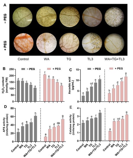 Figure 8. Effect of WA, TG, and TL3 inoculation on M. oleifera ROS production and antioxidant system. (A) DAB staining using leaf segment from 35-d-old plants, (B) H2O2 level, (C) AsA, (D) ascorbate peroxidase activity, and (E) catalase activity. Quantitative data represent means ± SE of three independent biological replicates presented with various letters showing differences at a significance level of p ≤ 0.05 using Duncan’s multiple range test (DMRT).