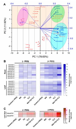Figure 9. (A) Principal component loading plot and scores of principal component analysis (PCA) of physiochemical parameters, chlorophyll b, chlorophyll a, carotenoids, proteins, phenols, sugars, flavonoids, lipids, proline, IAA, GA, SA, AA, peroxidase, anti-oxidant, catalase, ABA and H2O2 of M. oleifera as affected by PEG-mediated drought stress under different endophytic treatments: WA, TG, and TL3 alone or in combination (WA, TG, and TL3) compared with the non-inoculated respective controls (0% PEG and 8% PEG). The scores show the contribution of individual treatments on plant traits, as indicated by the direction and magnitude of the eigenvector vectors, (B) expression profiling of HSF genes, and (C) APX gene measure by RT-qPCR. Quantitative data represent the means ± SD of three independent experiments and at least three technical replicates each.