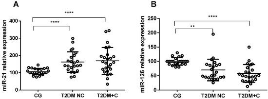 Relative expression of circulating (A) miR-21-5p and (B) miR-126-5p in T2DM patients without complications (T2DM NC), diabetics with complications (T2DM + C), and in controls (CG). Data are presented as means ± standard error of the mean (SEM). Comparisons between groups are indicated in the graphs. ** p < 0.01, and **** p < 0.0001.