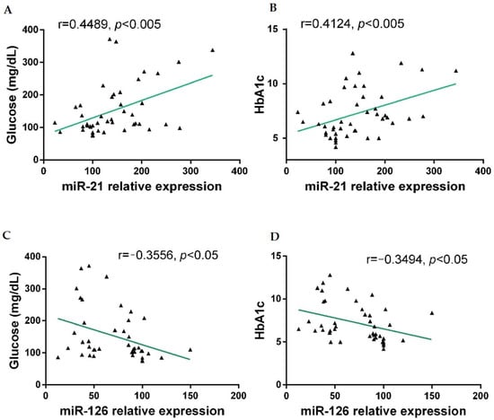 Correlations of relative circulating miR-21 and miR-126 with biochemical parameters in participants were calculated using Pearson correlation coefficient (r) analysis. Correlations between relative miR-21 expression and glucose levels (A), miR-21 and HbA1c (B), relative miR-126 expression and glucose (C), and miR-126 and HbA1c (D) were significative.