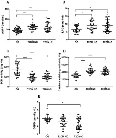 Determination of extracellular oxidative status through analysis of LPO and AOPP levels in plasma revealed that T2DM NC and T2DM + C patients presented significantly higher levels of both markers, with p < 0.001 for AOPP and p < 0.05 for LPO (Figure 3A,B).