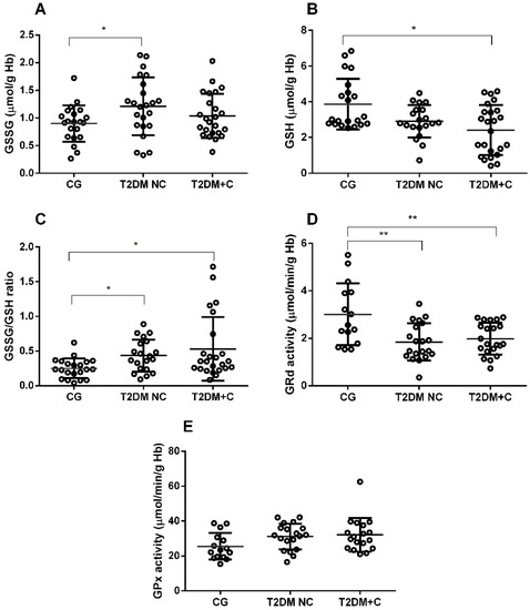 Regarding glutathione cycle components, GSSG levels were significantly higher in the T2DM NC group and significantly lower GSH in the T2DM + C group, compared with healthy controls (p < 0.05; Figure 4A,B). Additionally, we found an increased GSSG/GSH ratio in both diabetes groups compared with healthy participants. (p < 0.05; Figure 4C). GRd presented significantly lower activity in both diabetes groups compared with the control group (p < 0.01); however, GPx had no significant changes in activity (Figure 4D,E).