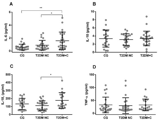 The concentration of pro- (IL-6, IL-18, and TNF-α) and anti-inflammatory cytokines (IL-10) in plasma samples from diabetic and control groups. (A) IL-6; (B) IL-10; (C) IL-18; and (D) TNF-α were assessed. Comparisons between groups are indicated in the graphs. Data are presented as mean ± SEM. * p < 0.05, ** p < 0.01, vs. control.