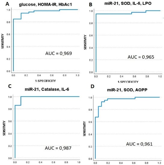Receiver operator characteristic (ROC) curves generated for sensitivity analysis show diagnostic performances of plasma markers including the following models: (A)-glucose, HOMA-IR, HbA1c; (B)-miR-21, SOD, IL-6, LPO; (C)-miR-21, catalase, IL-6; (D)-miR-21, SOD, and AOPP. AUC-area under the curve.