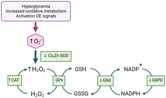 Summary of redox status changes detected in the population studied. Significant reduction of glucose-sensitive SOD activity causes an increase in CAT compensative activity, and GPx activity tends to increase. Decreased G6PD activity limits NADPH levels, contributing to the reduction of GRd activity, which leads to an increased GSSG/GSH ratio. All arrows indicate the directions of biochemical reactions. Created with BioRender.com, (accessed on 16 August 2022).