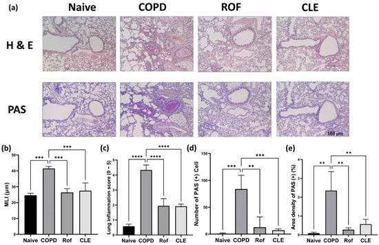 Male BALB/C mice (5 weeks old, 20 g) were purchased from Orient Bio (Gyeonggi, Korea). After a 1-week acclimation period, mice were randomly divided into the following four groups: control group (Naïve, n = 10), PPE/CSE-treated group (COPD, n = 10), PPE/CSE and 200 mg/kg CLE treated group (CLE, n = 10), and 10 mg/kg roflumilast-treated group (ROF, n = 10), as the positive control. The human effective dose (HED) of CLE 200 mg/kg was calculated as 16.22 mg/kg. Considering the average human body weight is 60 kg, daily administration dosage was 973 mg. The dosage of ROF (10 mg/kg) was decided based on the references [24,25] that indicate ROF effectively attenuated COPD symptoms such as airway inflammation, mucus overproduction, and alveolar destruction. To set the COPD model, mice were intranasally treated with 20 μL of PPE (1.2 U/head) once a week and CSE (100%) three times a week from days 7 to 18. We decided the dose of PPE/CSE by referring to following references presenting typical COPD symptoms such as airway inflammation, mucus overproduction, and emphysema [26,27]. The COPD and CLE groups were given 200 μL/mouse of PBS or CLE diluted in PBS from days 0 to 18. The ROF group was given 200 μL/mouse of roflumilast (ROF) diluted in PBS, orally administered from days 7 to 18. ROF is a drug that acts as a selective, long-acting inhibitor of the enzyme phosphodiesterase-4 (PDE4) for severe COPD associated with chronic bronchitis, and is used after COPD diagnosis due to side effects. Therefore, ROF was treated after inducing COPD. The mice were sacrificed on day 19. BALF, blood, and lung tissue were collected for analysis. All animal procedures were performed in accordance with the animal use and care of the Korea Food Research Institute (approval number: KFRI-M-19001) Animals were maintained in the same room under conventional conditions, with a regular 12 h light/dark cycle, and temperature and relative humidity maintained at 23 ± 2 °C and 50 ± 5%, respectively. Mice were allowed free access to food and water.