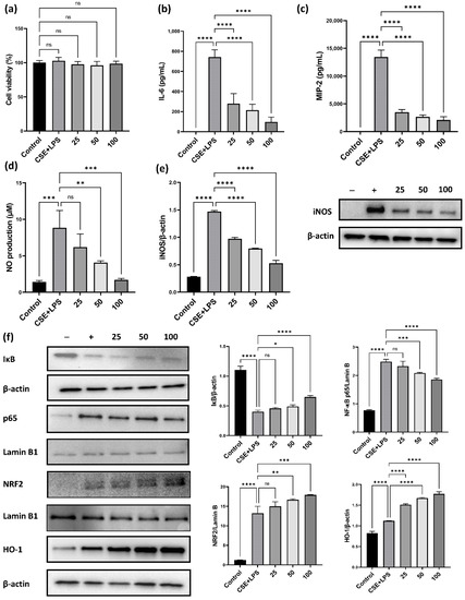 Effect of the CLE on cell viability and the production of cytokines, NO and the activation of NF-κB and NRF2 pathways in MH-S macrophages. For the cell viability assay, (a) the MH-S macrophages were co-treated with 25, 50, 100 μg/mL of CLE and 1% CSE and 10 ng/mL LPS for 24 h. Cell viability was estimated by the WST assay. Then, IL-6 (b) and MIP-2 (c) in the culture supernatants were quantified using ELISA assays. NO production levels (d) were determined using Griess assay. (e,f) Protein expression levels of iNOS, IκB, NF-κB p65, NRF2, HO-1, β-actin, and Lamin B1 were visualized using Western blots. Data were analyzed by one-way ANOVA using Dunnett’s test. All values are reported as mean SD. * p < 0.05, ** p < 0.01, *** p < 0.001, **** p < 0.0001. CLE: Camellia sinensis L. extract, NO: Nitric oxide, NF-κB: Nuclear factor-κB, NRF2: Nuclear factor-E2-related factor 2, CSE: Cigarette smoke extract, LPS: Lipopolysaccharide, IL-6: Interleukin 6, MIP-2: Macrophage inflammatory protein-2, iNOS: Inducible nitric oxide synthase, HO-1: Heme oxygenase-1.