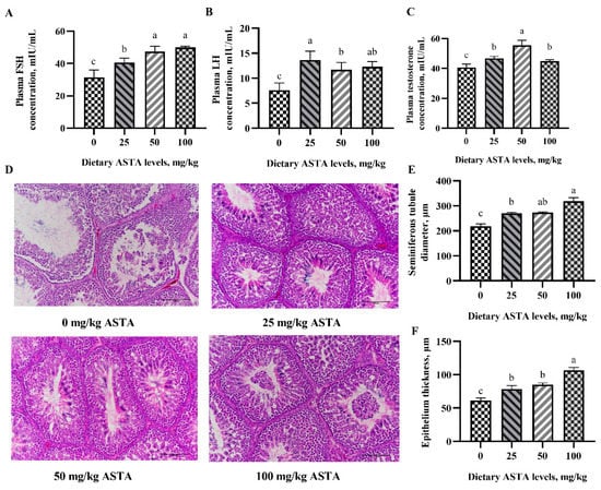 Testosterone is a key hormone related to spermatogenesis and metabolism, whose secretion is stimulated by FSH and LH. Generally, LH activates the protein kinase A (PKA) pathway and promotes the expression of key steroid genes by stimulating G proteins and adenylyl cyclase. Figure 1A–C show the effect of dietary ASTA supplementation on the levels of reproductive hormones in the plasma. When the concentration of ASTA reached 50 mg/kg, the FSH and testosterone levels increased remarkably compared to the control group (p < 0.05). In the group with 25 mg/kg ASTA supplementation, LH levels were significantly higher compared to the control group and reached a maxima (p < 0.05). The results also showed that the diameter of the seminiferous tubules and thickness of the epithelium were markedly increased in the ASTA groups (p < 0.05) (Figure 1D–F).