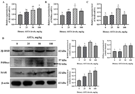Effect of dietary ASTA supplementation on the expression of testosterone synthesis pathway intermediaries at the mRNA and protein level in the testes of aging roosters. (A–C) The expression of testosterone synthesis pathway intermediaries at the mRNA level; the values are expressed as means ± standard deviation, n = 6 in each group. (D) The expression of testosterone synthesis pathway intermediaries at the protein level; the results are expressed as mean ± standard deviation (n = 3). a–c Means within a row with no common superscripts are significantly different (p < 0.05).
