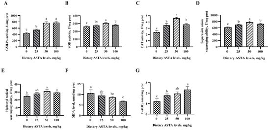 Effect of dietary ASTA supplementation on antioxidant enzyme activity and free radicals in the sperm of aging layer breeder roosters. (A) GSH-Px activity, (B) SOD activity, (C) CAT activity, (D,E) scavenging free radical ability, (F) MDA level, and (G) T-AOC ability. The data represent mean ± standard deviation; n = 6 in each group. a–c Means within a row with no common superscripts are significantly different (p < 0.05).