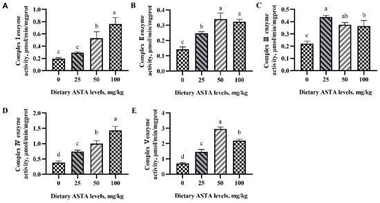 Effect of dietary ASTA supplementation on the activities of OXPHOS complexes. (A) NADH ubiquinone oxidoreductase (complex I), (B) succinate dehydrogenase (complex II), (C) ubiquinol cytochrome C reductase (complex III), (D) cytochrome C oxidase (complex IV), and (E) ATP synthase (complex V). The data represent mean ± standard deviation; n = 3 in each group. a–d Means within a row with no common superscripts are significantly different (p < 0.05).