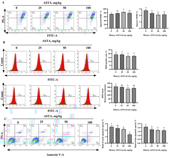 Effect of dietary ASTA supplementation on the level of MMP, ROS, and apoptosis of sperm. (A) MMP levels of sperm are measured by flow cytometry assay, (B) ROS level, and (C) sperm apoptosis level. The data represent mean ± standard deviation; n = 6 in each group. a–c Means within a row with no common superscripts are significantly different (p < 0.05).