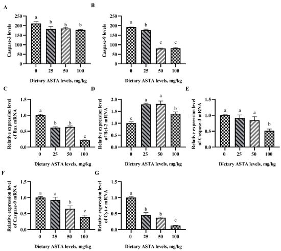 Effect of dietary ASTA supplementation on apoptotic factors in the testes of aging roosters. (A) Caspase-3 level and (B) caspase-9 level. The mRNA expression of (C) Bax, (D) Bcl-2, (E) Caspase-3, (F) Caspase-9, and (G) Cyt-c relative to that of β-actin (ACTB). The data represent the mean ± standard deviation; n = 6 in each group. a–c Means within a row with no common superscripts are significantly different (p < 0.05).
