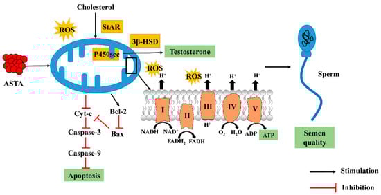 ASTA: Astaxanthin; FSH: Follicle-stimulating hormone; LH: Luteinizing hormone; T: Testosterone; GSH-Px: Glutathione peroxidase; SOD: Superoxide dismutase; CAT: Catalase; MDA: Malondialdehyde; T-AOC: Total antioxidant capacity; ROS: Reactive oxygen species; MMP: Mitochondrial membrane potential; StAR: Steroidogenic acute regulatory protein; P450scc: Cholesterol side-chain cleavage enzyme; 3β-HSD: 3β-hydroxysteroid dehydrogenase; Cyt-c: Cytochrome c.