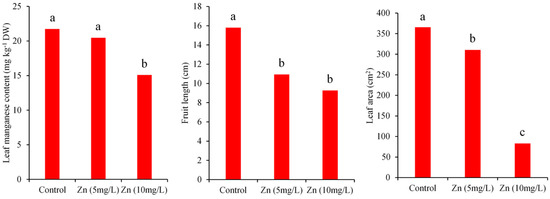 Main effects of added Zn concentration on leaf Mn content, fruit length, and leaf area of C. pepo L. The plot represents means of triplicates. Different alphabetic letters on each bar show significant differences at the 5% level between simple effects of treatments according to Duncan’s multiple range mean comparison test.