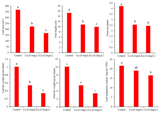 Main effects of added Cu concentration on growth traits and leaf Mn content of C. pepo L. The plot represents means of triplicates. Different alphabetic letters on each bar show significant differences at the 5% level between simple effects of treatments according to Duncan’s multiple range mean comparison test.