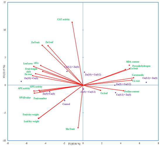The highest values of fruit and leaf dry weight were obtained by control treatments without any addition of Cu and Zn to the nutrient solution, as confirmed by principal component analysis (Figure 2 and Figure 3). Notably, fruit dry weight was decreased by about 186%, and 296% under copper application at 0.1 and 0.2 mg L−1, respectively (Figure 2). These findings are well-matched with the results of the Dong et al. [29] study, which revealed that the application of copper at high concentrations could result in a diminishment of shoot dry weight, fruit number, and leaf area in tomato.