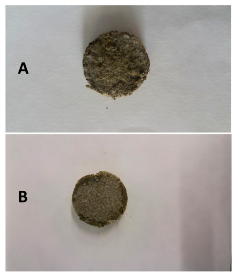 Dry milled olive leaves were hydrated to 65% moisture content with distilled water, supplemented with yeast extract (1 g/L), NaHPO4 (1 g/L), MgSO4 (0.5 g/L) and KCl (0.5 g/L) to encourage fungal growth. Then, the material was autoclaved (121 °C, 20 min). Cooled material was inoculated with spore suspension (106 spores per 25 g of raw substrate) or mycelium fragments (3 loops per 25 g of raw substrate) of R. oligosporus, N. intermedia or A. oryzae strain. Inoculated substrate was transferred into Petri dishes (3 cm diameter, 3 replicates for each variant) and incubated at 30 °C and 60% air humidity. Among the strains tested, only A. oryzae was capable of growing on olive leaves. It was previously reported that olive leaf extract showed inhibitory effect on some fungal strains, concerning spore germination and/or mycelium growth [31]. The substrate was fully overgrown by mycelium after 5 days (AO5-m) (Figure 1A) and 8 (AO8-s) days (Figure 1B), respectively, when mycelium and spores were used as inoculating material.