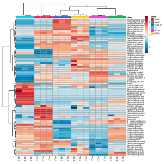Analyzing the results of control samples, it is very clear that the red colored boxes corresponding to oleuropein-derivatives (particularly oleuropein aglycone and glucoside), rutin, luteolin-glucosides depicts the high amounts of these phenolics as compared to other samples. Aaw fermented samples reported a cluster related to the high amounts of apigenin glucoside, quercetin and β-hydroxyverbascoside isomers. Generally, fermented samples showed sub-clusters indicating the higher amounts of elenolic acid derivatives, hydroxytyrosol-derivatives, some oleuropein isomers, and oleoside.