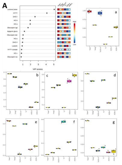 VIP score of PLS-DA analysis (A) and box plots (a–g) reporting the amounts of targeted compounds with VIP score > 1 in the different samples. HYTY, hydroxytyrosol; DHO, dihydroxyoleuropein; HO, hydroxyoleuropein.