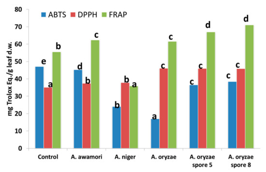 Antioxidant activity evaluated by ABTS assay ranged between 17 and 47.1 mg Trolox equivalent/g leaf d.w. and the control sample showed the highest value. According to the obtained data, all the samples fermented with the A. oryzae reported the highest values of antioxidant activity with DPPH radical assay; contrary, control was the lowest one. Briefly, sample fermented by A. niger showed the lowest value of antioxidant activity evaluated by FRAP, the samples fermented with the spores of A. oryzae showed the highest one. These data confirmed as the different phenolic compounds present different mechanisms of action. Figure 5 reports the Pearson’s correlations between the antioxidant activity and the phenolic composition.