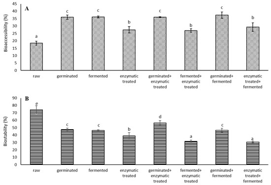 (A) Bioaccessibility and (B) biostability of total phenolic content (TPC) from raw and bioprocessed spelt seeds after in vitro digestion. The percentages were calculated with respect to corresponding undigested spelt seed TPCs. Results were expressed as the mean of three replicates and the error bars indicate standard deviation. Different letters indicate significant differences (p < 0.05; Duncan’s Multiple Range Test).
