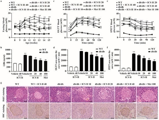 ICS II improved glucose metabolism, insulin sensitivity and pancreatic islet architecture in db/db mice. ICS II at doses of 10, 20, or 40 mg·kg−1 was administered to db/db mice or WT mice (starting from 8 weeks old) for 7 weeks. (a) 12 h fasting blood glucose of the mice (n = 8). (b) GHb level (n = 8). OGTT (c,d) and IPITT (e,f) were performed after 6 weeks of ICS II administration and the AUCs were calculated (n = 8). (g) H&E staining and insulin immunostaining (×400, scale bar = 50 μm). Data were expressed as mean ± SEM. ** p < 0.01 versus WT group; # p < 0.05 and ## p < 0.01 versus db/db group.