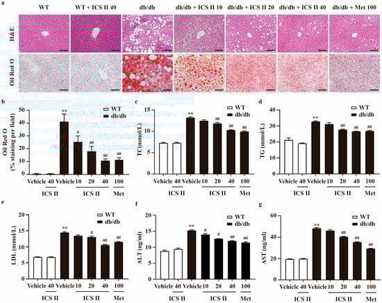 Liver HE staining illustrated severe fatty degeneration hepatocytes, and numerous vacuolated and swollen hepatocytes in db/db mice. However, ICS II significantly alleviated vesicular steatosis and ballooning in the liver of db/db mice. Moreover, Oil Red O staining of frozen liver sections further showed that hepatic lipid accumulation was decreased in ICS II treated db/db mice, manifested as relatively lighter red, compared with model control showing many lipid droplets in deep red (Figure 2a,b). In line with the hepatic lipid accumulation in the db/db model, liver weight of db/db mice was higher than that of WT mice, and ICS II significantly decreased the values of the index (Supplementary Figure S1b). To further explore the effect of ICS II on lipid metabolism, several blood parameters were analyzed. In db/db mice, serum total cholesterol (TC), triglycerides (TG) and LDL-cholesterol were obviously higher than that of WT mice. In ICS II-treated mice, these parameters were pronouncedly reduced (Figure 2c–e). Similarly, ICS II evidently alleviated high levels of plasma ALT and AST in db/db mice (Figure 2f,g). These results suggest that ICS II mitigates hepatic steatosis, hyperlipidemia, and liver damage.