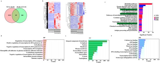 DEGs were determined in the condition of both p value < 0.05 and FC > 1.5. As shown in Figure 3a, there were 2618 overlapped DEGs between WT versus db/db, 398 overlapped DEGs between db/db + ICS II versus db/db, and only 89 overlapped DEGs among the three groups. Moreover, hierarchical clustering analysis showed that the expression profiles of the DEGs in WT and db/db + ICS II groups were significantly different to that of the db/db group (Figure 3b). Furthermore, KEGG pathway analysis and enrichment of GO terms ascertained a considerable enrichment of genes involved in PPAR signaling pathway, insulin signaling pathway, and NF-κB signaling pathway (Figure 3c). The top 10 biological processes (BP), cellular components (CC), and molecular functions (MF) for up-regulated or down-regulated DEGs are listed in a bar chart (Figure 3d–f).