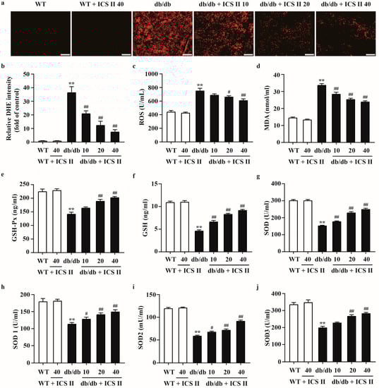 To evaluate the effect of ICS II on oxidative stress in T2DM, the oxidative markers were determined using DHE staining and ELISA assay. The results showed that higher levels of DHE fluorescence intensity in livers and pancreas tissues of db/db mice compared with those of WT mice. ICS II evidently reduced DHE fluorescence intensity (Figure 4a,b and Supplementary Figure S2a,b). As shown in Figure 4c,d, ICS II also decreased the ROS and MDA levels in ICS II treated db/db mice than those of db/db mice. Moreover, ICS II significantly upregulated activities of GSH-Px (Figure 4e), GSH (Figure 4f), SOD (Figure 4g), SOD1 (Figure 4h), SOD2 (Figure 4i), and SOD3 (Figure 4j) in ICS II-treated db/db mice than those of db/db mice. These results indicate that ICS II attenuates oxidative injury in diabetic mice through inhibiting disequilibrium of redox status.